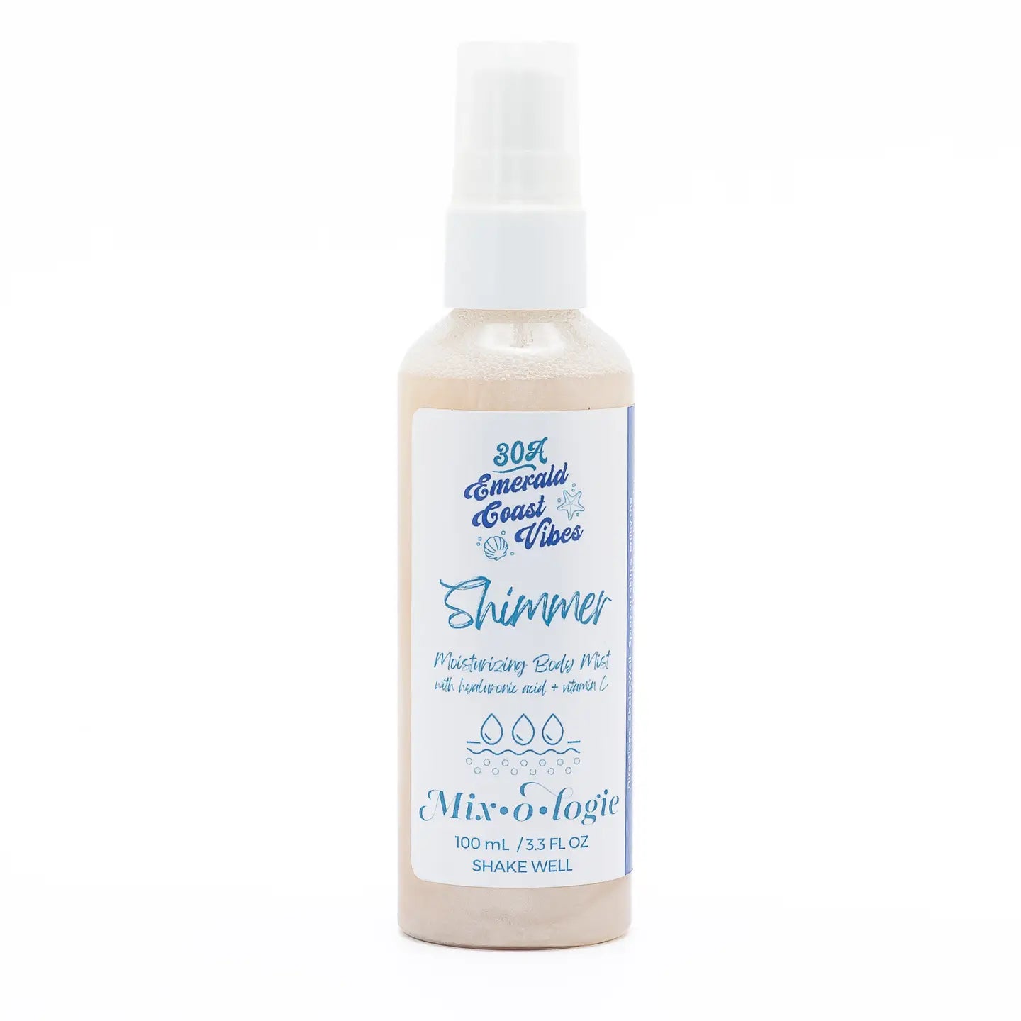 Time to Shine! A beautifully scented mist that doubles as skin care. Take your skin care to the next level with this ultra-hydrating formula that leaves a beautiful gold shimmer effect to highlight your healthy skin. Boosted with: Hyaluronic Acid - a powerhouse hydrator that leaves skin moisturized, supple, and youthful Vitamin C - a potent but skin-friendly antioxidant that fights off free radicals to keep skin healthy and glowing Shake well (the shimmer settles in the bottle) & apply anywhere on skin that you want to shimmer! Perfect to highlight your summer tan. Spray on face, décolletage, arms, legs, anywhere! Experience the scent of the tropics with our 30A Emerald Coast Vibes . Let your senses be inspired by this perfect fragrance. A beach vacation in a bottle! Experience a crisp, clean escape to the beaches of the Emerald Coast. The soothing scent of salty marine air mingles with hints of coconut, bergamot, sandalwood, and white musk.