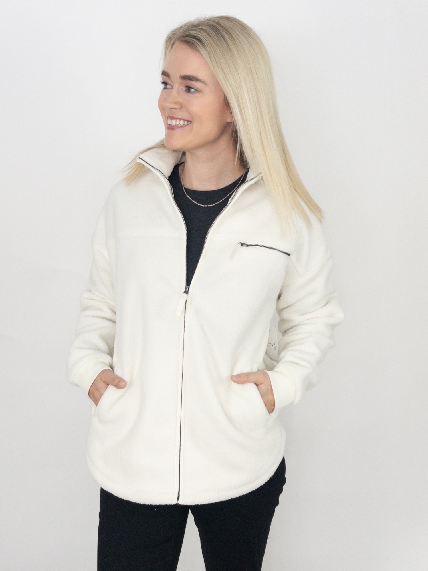 Wrap yourself in cloud-like comfort with this ivory fleece jacket, the ultimate cozy companion for cool weather. Designed with a relaxed drop shoulder fit, convenient zip front, and roomy side pockets, it's as practical as it is plush. The extended shirt tail hem adds a laid-back vibe that works with everything. Perfect for layering on chilly mornings or gifting to someone who deserves a little extra warmth and style. Model is wearing size large.