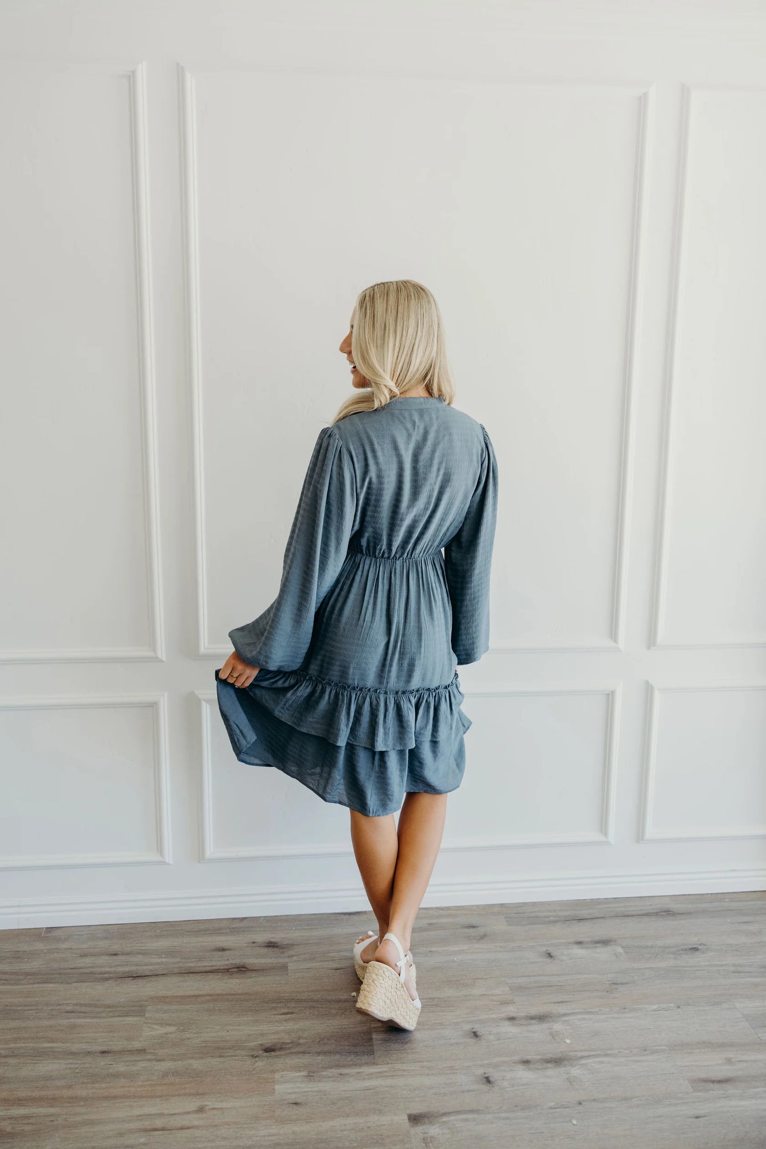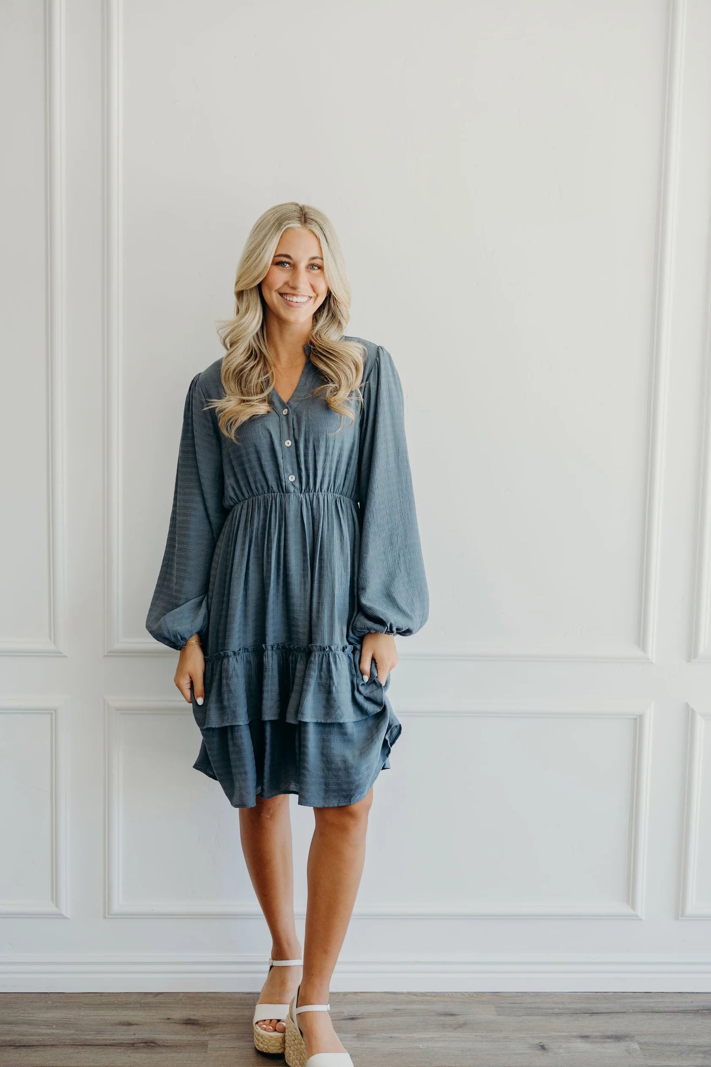 Knee length dress with double ruffle hem, elastic natural waist, v neckline with button detail, long balloon sleeves.