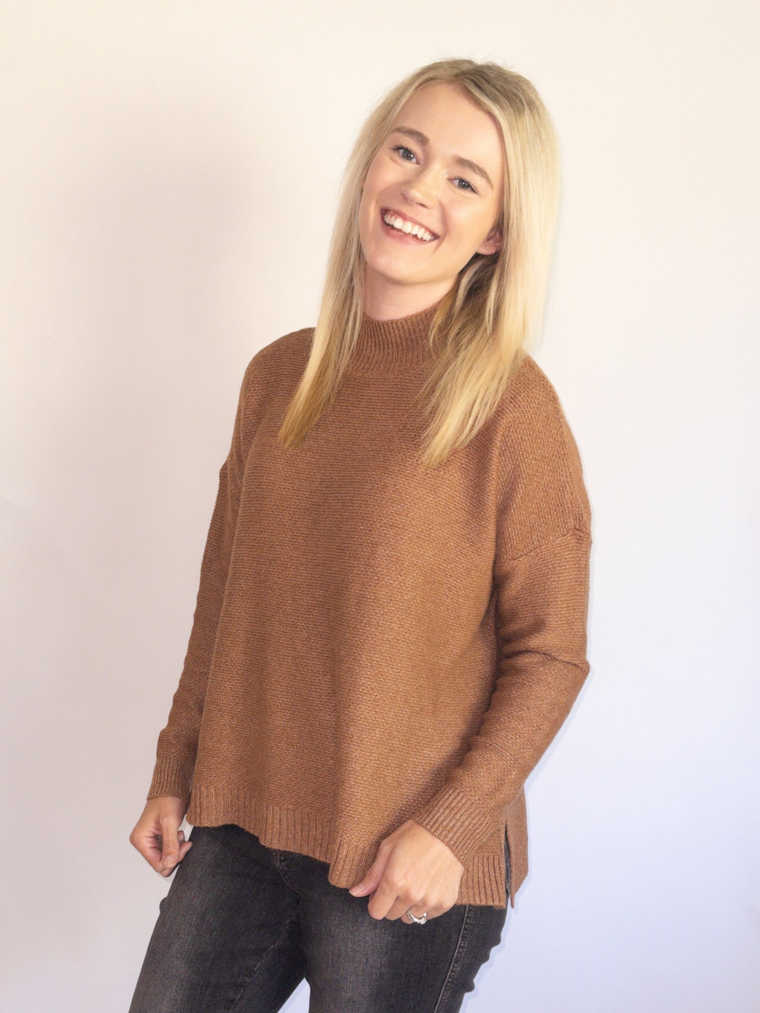 This playful pullover sweater features a cozy mock neck, long sleeves, and trendy side slits. With its marled texture and boxy fit, it's both comfortable and stylish.