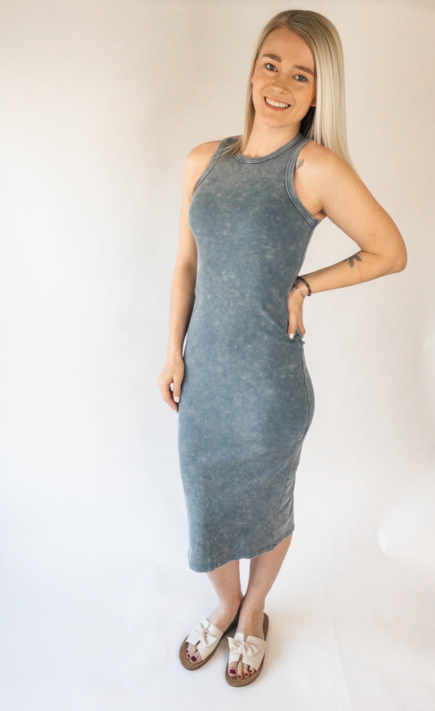 Get ready to rock this mineral wash dress! Made of soft ribbed fabric, it hugs your curves for a flattering fit. With a stylish sleeveless design and trendy blue color, this dress is perfect for any occasion. So go ahead and rock this dress with confidence!