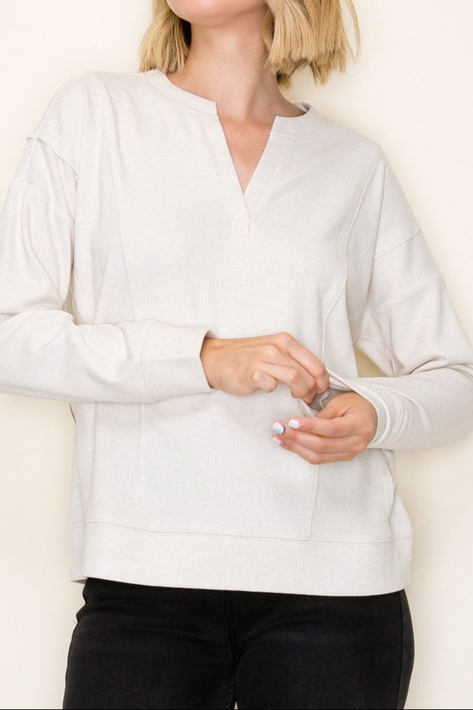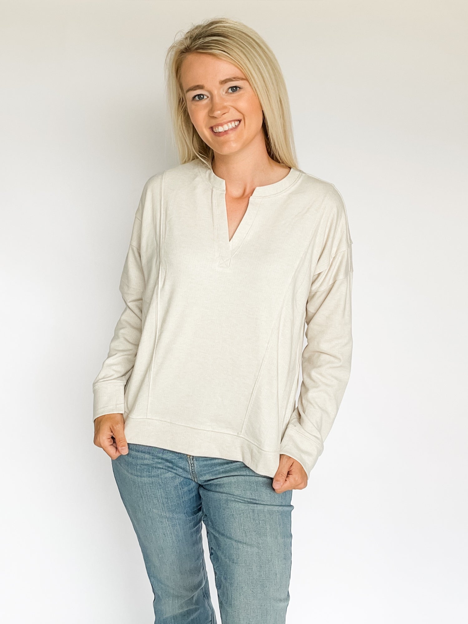 This fun pullover knit top features a split neckline and charming raw-edge seam details, with long sleeves for cozy comfort. Made from a soft blend of, it's perfect for casual days with a touch of flair.